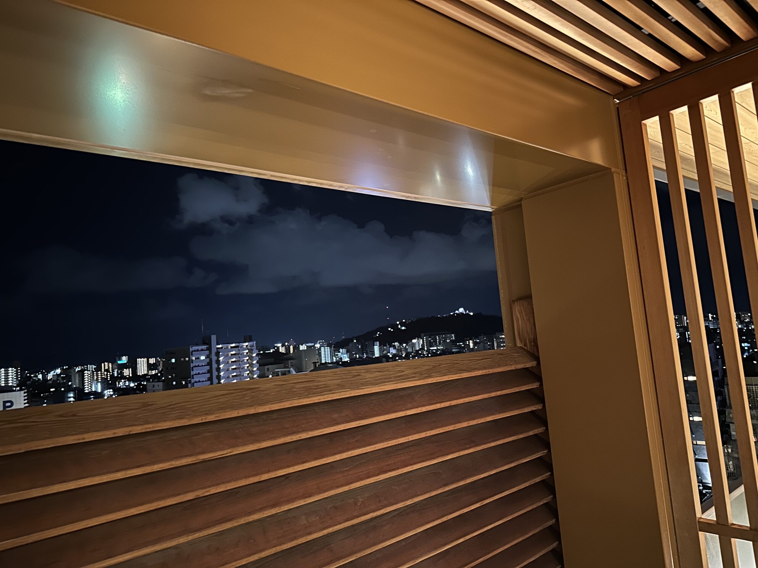 お部屋は、HPのリンクを見ていただくとして(手抜き)、お部屋の南側には露天風呂があり、そこからは、松山城が遠くに見えます👀